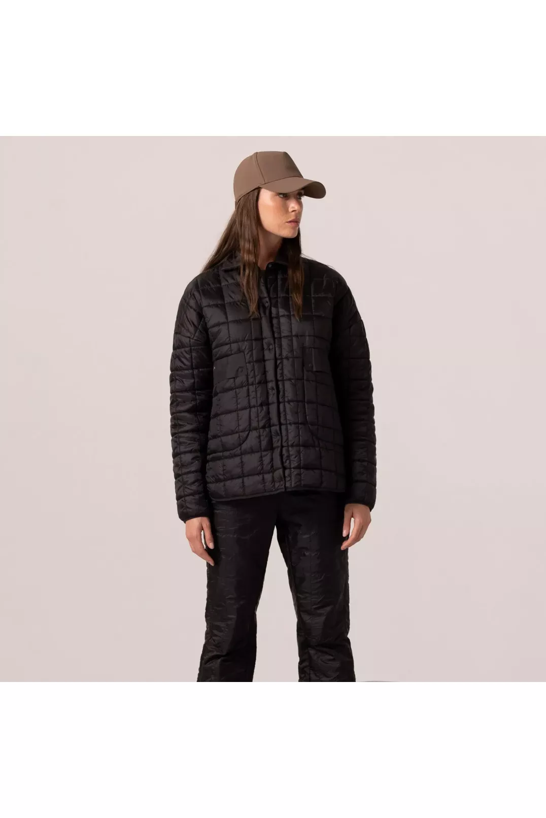 Стьобана куртка-сорочка з переробленого мікро-ріпстопу з вощеного нейлону. Вона наповнена легким плоским ватіном, який забезпечує тепло і мінімальний об'єм, а водовідштовхувальне покриття без PFC захищає від невеликого дощу. Ця куртка ідеально підходить для подорожей: вона практична, легка і може захистити від перепадів температури. Практичний передній виріз з ґудзиками і блискавкою, бічні кишені з клапанами і застібками-блискавками, а також округлі бічні розрізи надають виробу стильний вигляд.